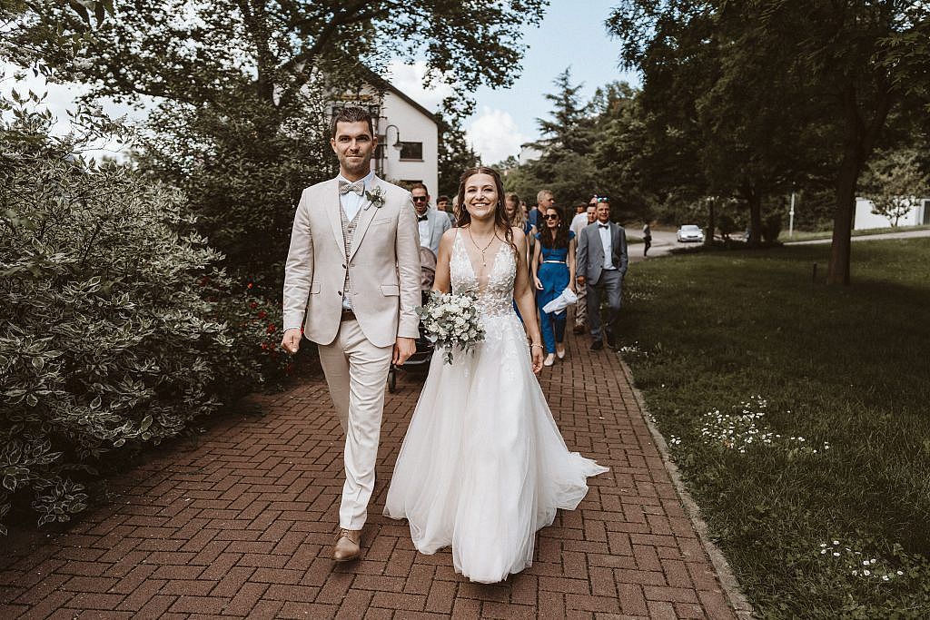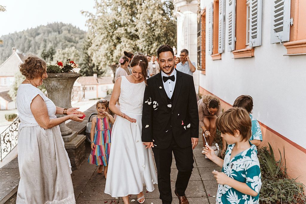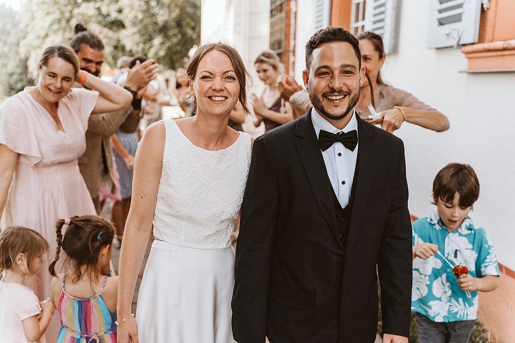 Dort, unter dem weiten Himmel des Markgräflerlandes, bildeten die Familien und Freunde aus aller Welt ein langes Spalier. Es ist dieser eine Augenblick, den ich als Hochzeitsfotograf besonders liebe: Wenn das Paar aus der kühlen Stille des Schlosses heraustritt und von einer Welle aus Jubel, Konfetti und Umarmungen überrollt wird.