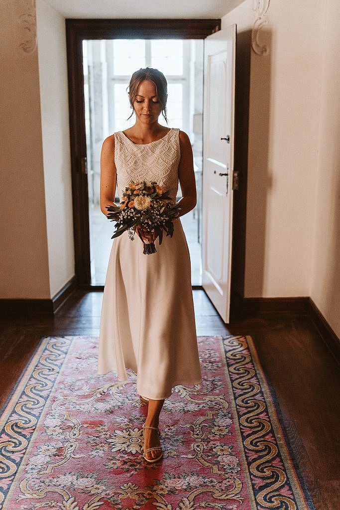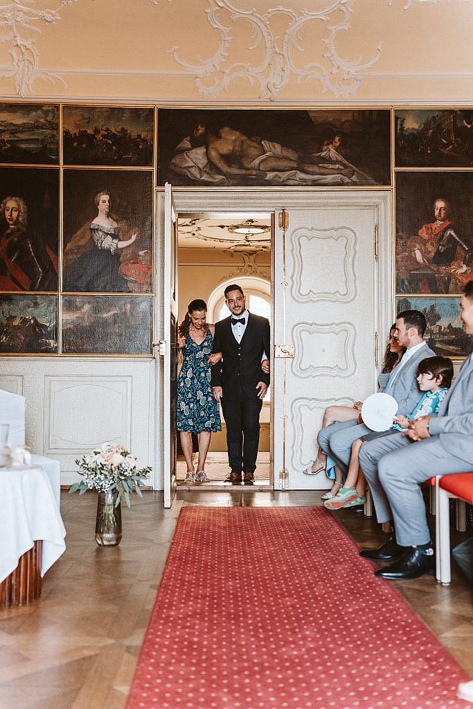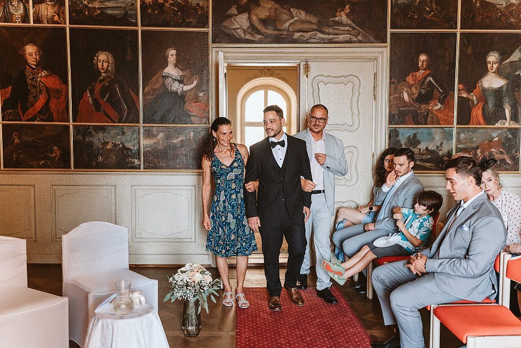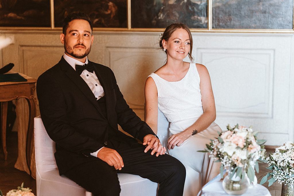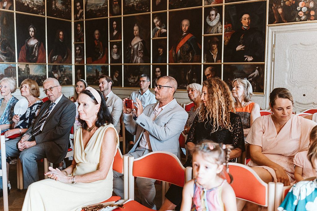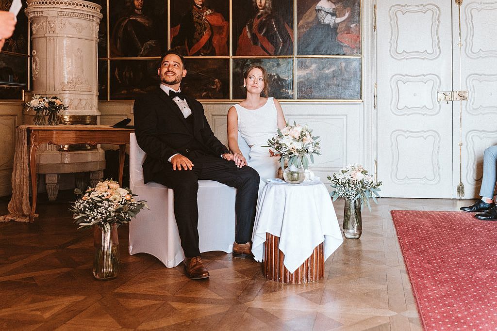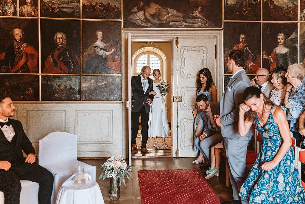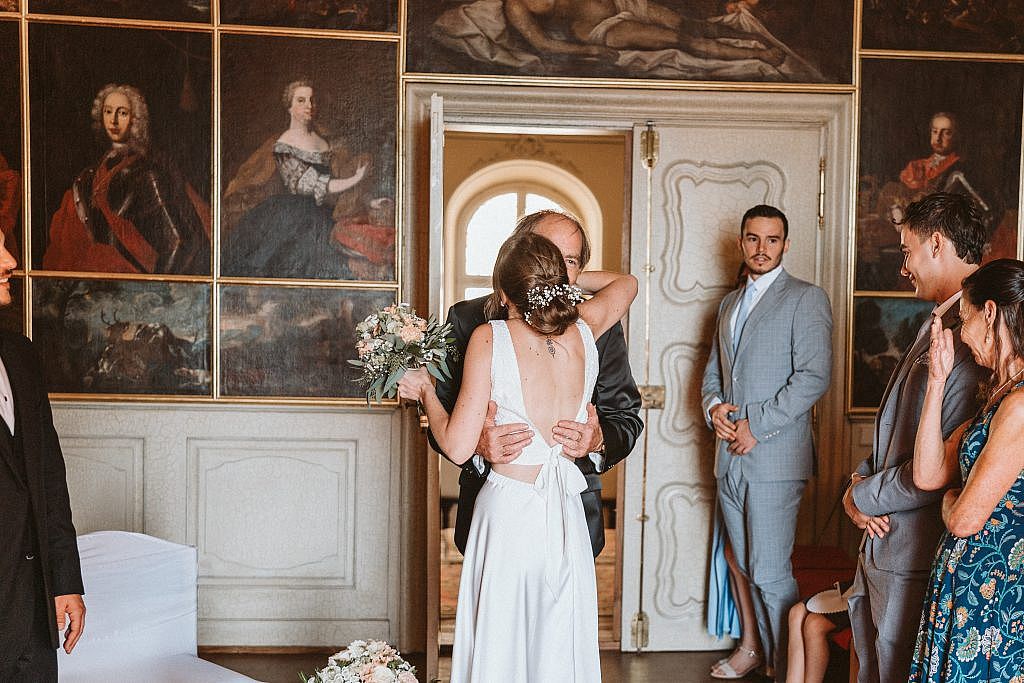 „Für die Zeremonie zogen wir uns in den prachtvollen Bildersaal von Schloss Bürgeln zurück. Doch trotz der herrschaftlichen Kulisse fühlte sich der Moment sofort unglaublich vertraut und nah an. Der Grund dafür war so persönlich wie selten: Die Freie Trauung wurde vom Vater der Braut selbst gestaltet.