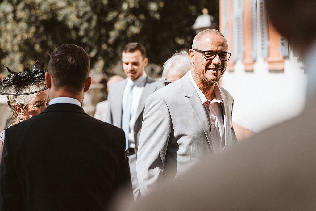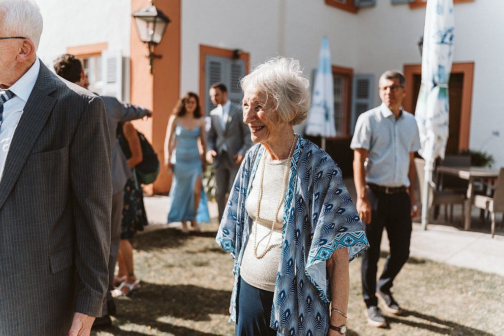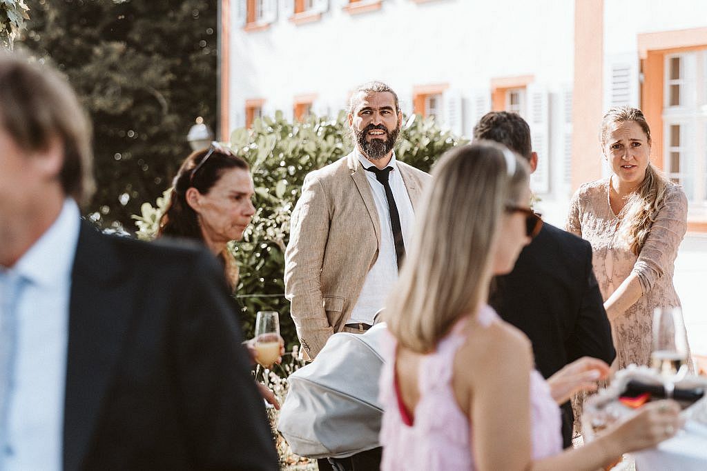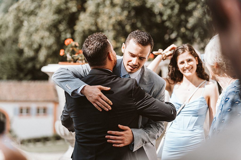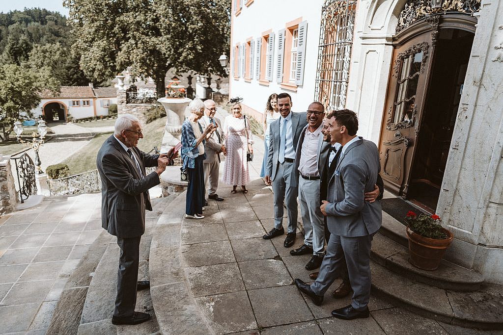 Diese echten, ungefilterten Emotionen bei der Ankunft der Gäste in Schliengen einzufangen, war für mich als Fotograf ein Privileg. Man spürte förmlich, wie die Vorfreude auf die bevorstehende Freie Trauung mit jedem Gast, der den Schlosshof betrat, weiter wuchs.“