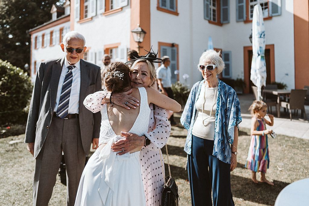 „Nach den privaten Momenten beim Shooting füllte sich der Schlosshof langsam mit Leben. Es war ein ganz besonderes Wirrwarr aus Sprachen und herzlichen Rufen. Da die Familien und Freunde aus den unterschiedlichsten Ecken der Welt angereist waren, war die Begrüßung auf Schloss Bürgeln weit mehr als ein bloßes Ankommen.