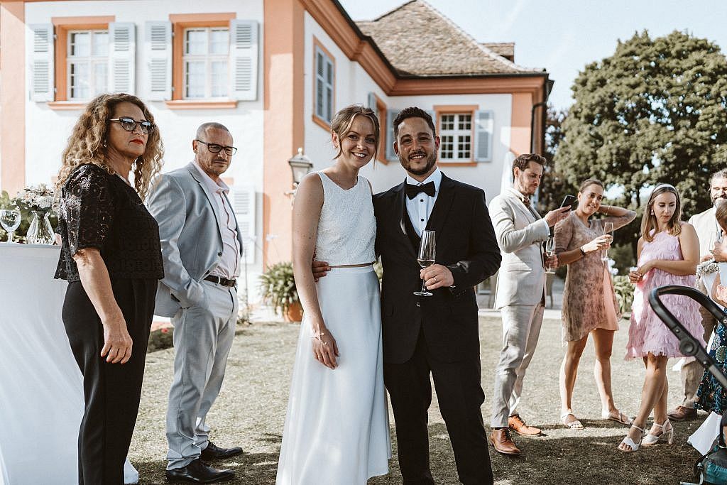 „Nach dem Ja-Wort und den letzten leisen Worten im Bildersaal füllte sich die Luft plötzlich mit einer ganz neuen Energie. Während das Brautpaar noch einen kurzen Moment für sich genoss, zogen die Gäste bereits nach draußen, um sich am Ausgang von Schloss Bürgeln zu versammeln.